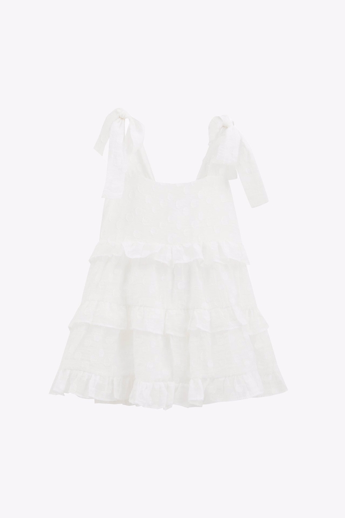 Dahlia Bianca'nın çocuk serisi, eğlenceli süslemeler ve zarif zarafetle kız çocuk gardıroplarına modern bir dokunuş katıyor. Zendaya elbise kolay bağlanan ip detayı, uyumlu püskülü ve küçük kabarık kollara sahiptir.