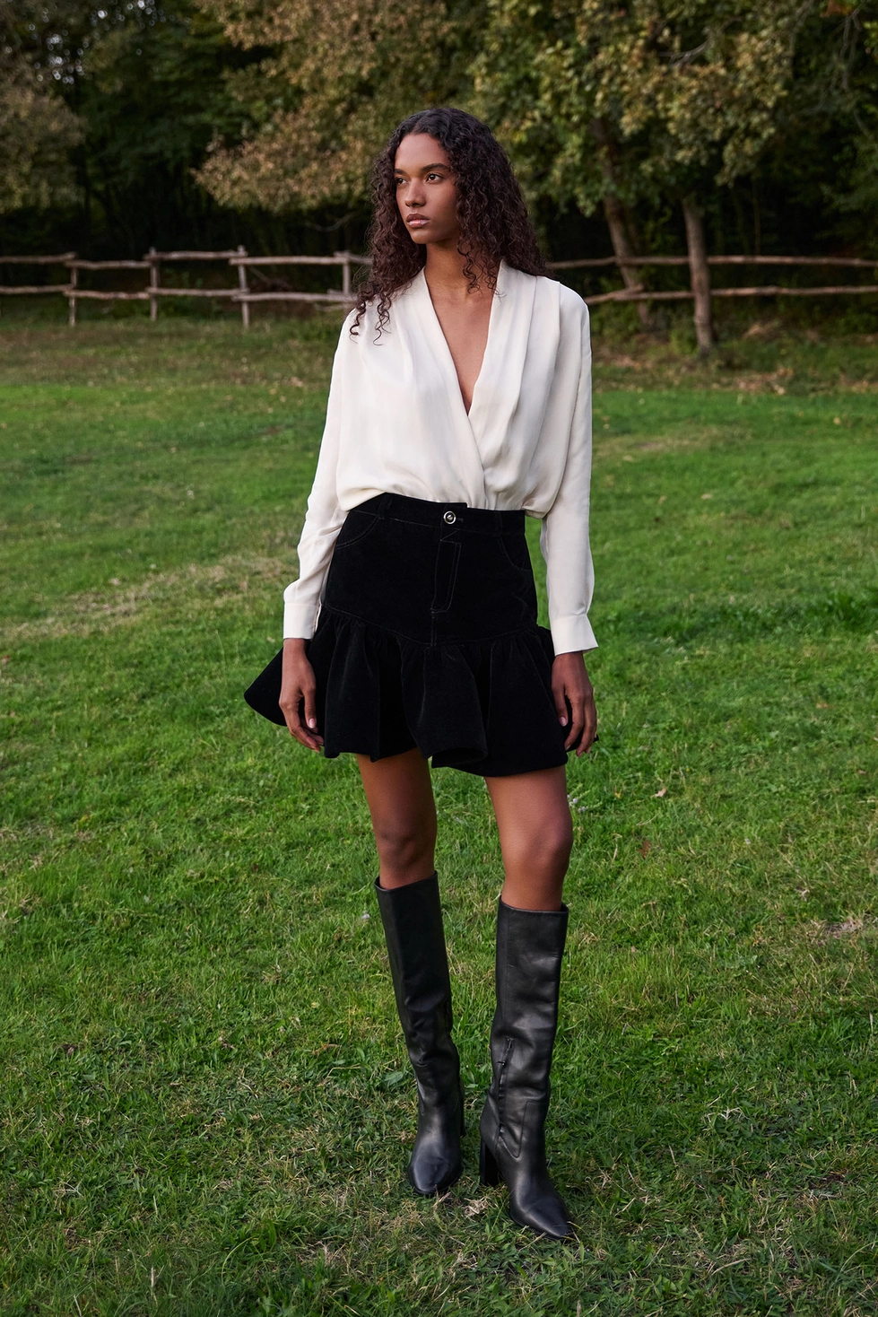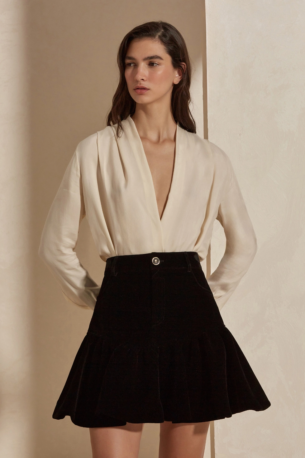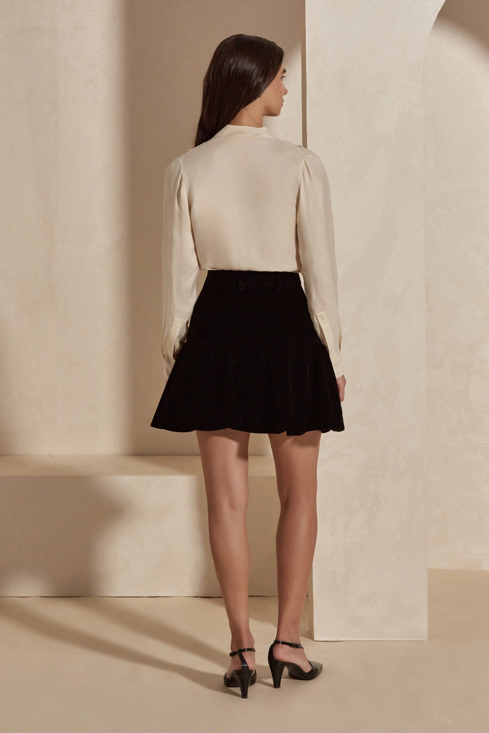 Arianna etek, önden fermuarlı ve düğmeli kapanışıyla şık bir seçenek sunuyor. Mini olan bu etek uçları volanlıdır ve beli ince gösteren bir kesime sahiptir. Eşsiz deseniyle dikkat çekerek farklı olmanızı sağlar..
