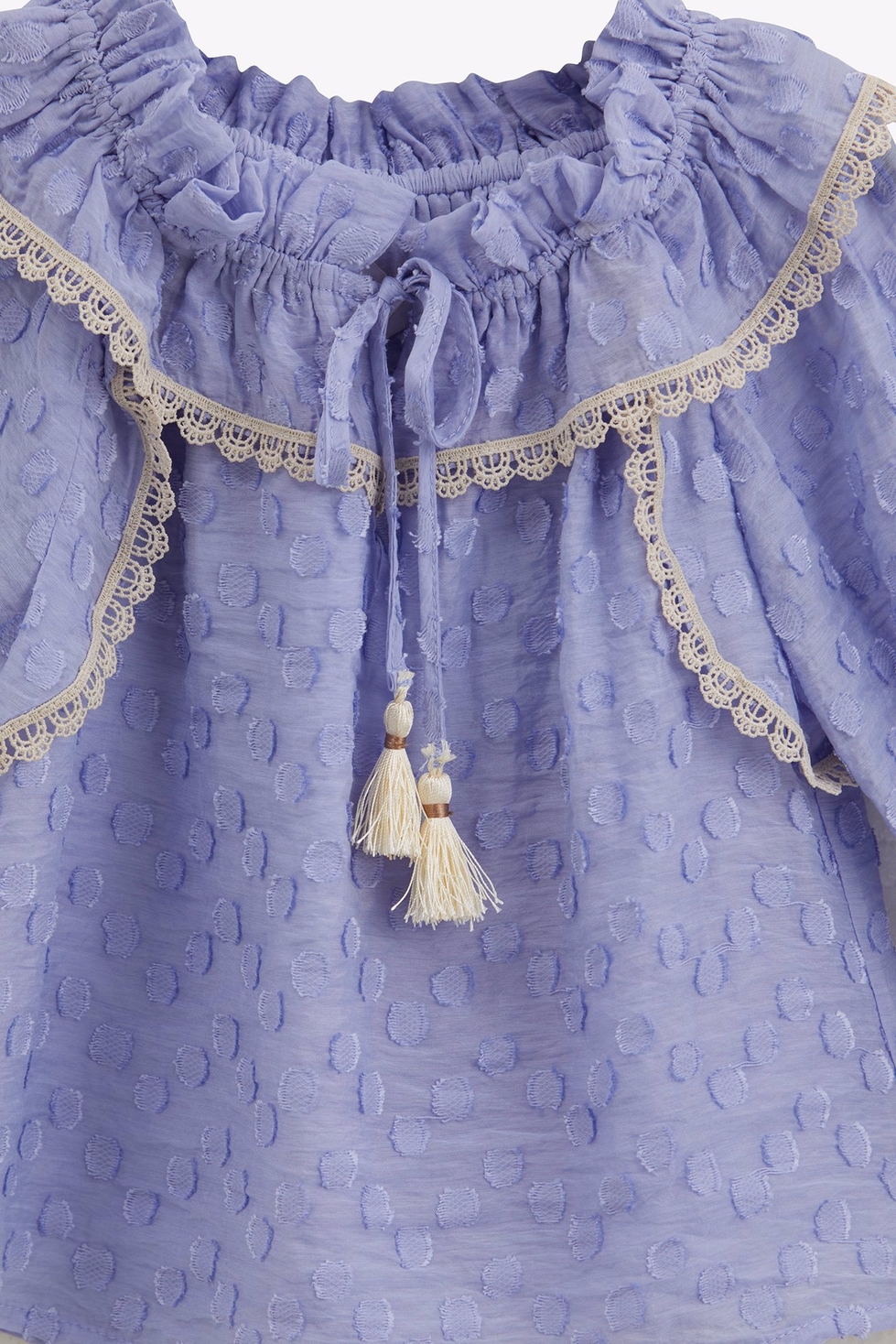 Dahlia Bianca's Scarlet blouse is made from airy viscose . Styled with a ruffle neck with self-fastening ties, the blouse allows for a comfortable full range of movement .The blouse is elevated with puffy sleeves with elasticated cuffs and contrast trims.