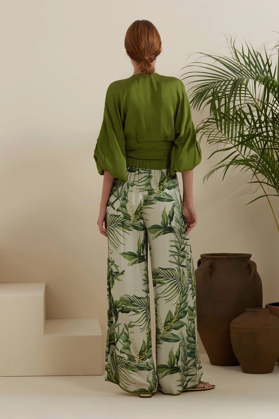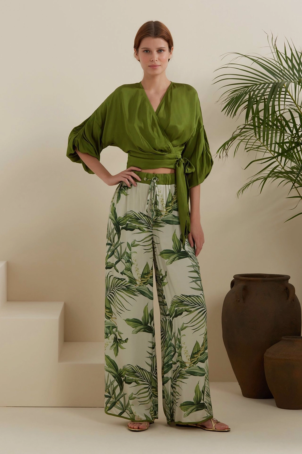 Marsilia pantolonu, nostaljik yaprak deseni ile bezeli bir tasarıma sahiptir. Hafif ve yumuşak viskon kumaştan üretilen bu pantolon, yüksek bel kesimi ile başlar ve geniş paçaları ile son bulur. İsterseniz lastikli ve desenin içindeki yeşil renge sahip beline kolayca bir gömlek sokup, şık bir görünüm kazanabilirsiniz. Uyumlu sandalet ve gömleklerle tarzınızı tamamlabilirsiniz