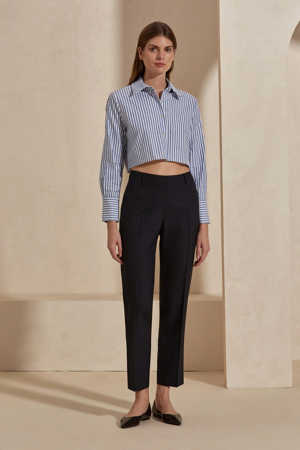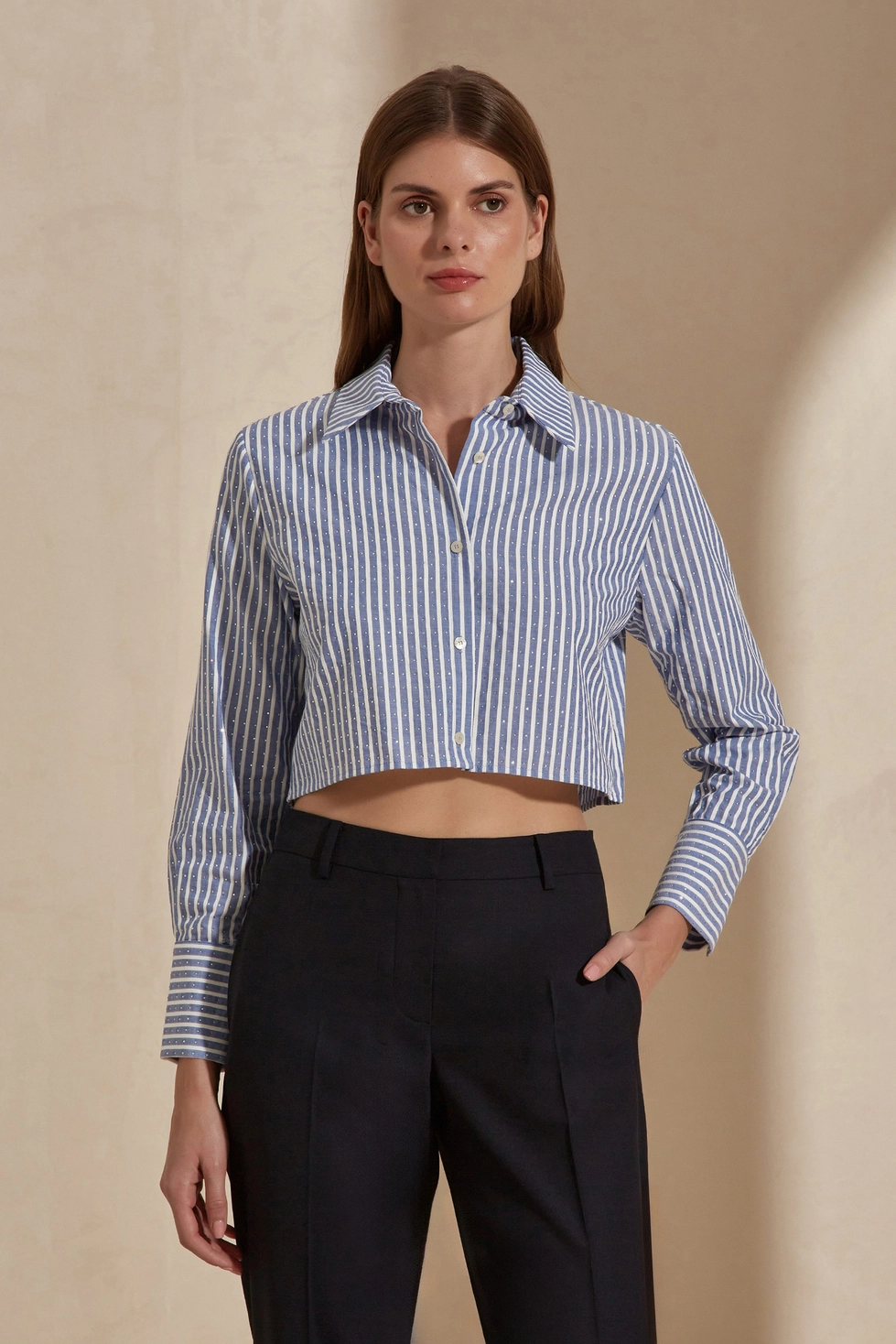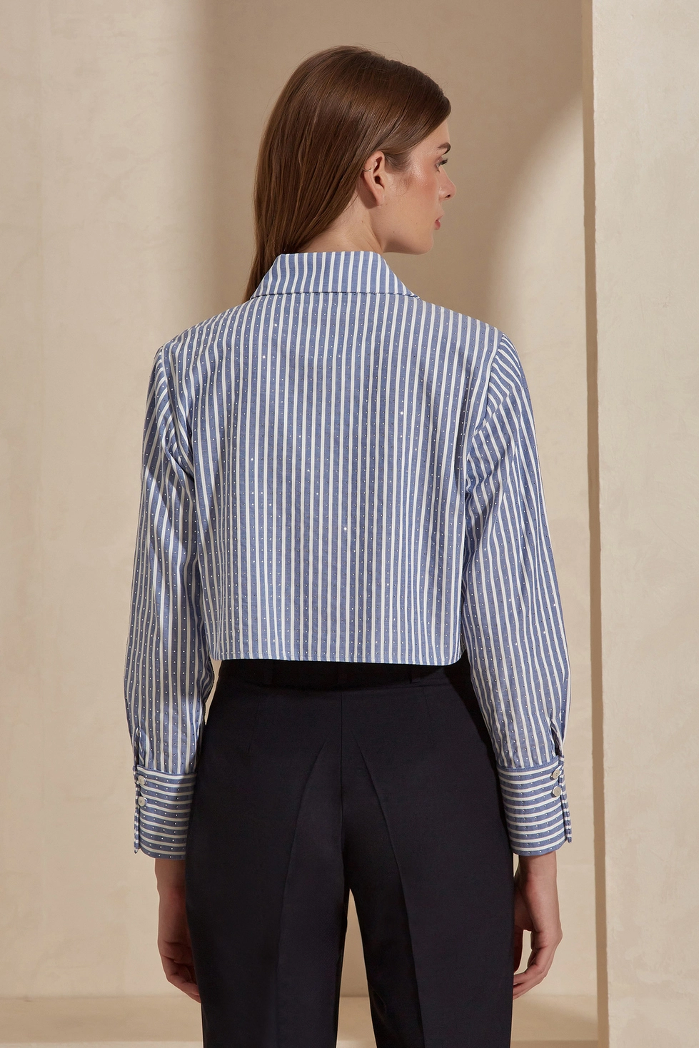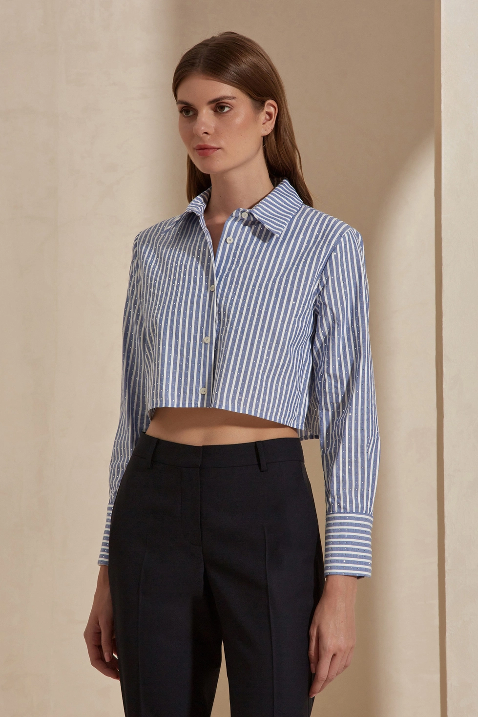 Sarai Gömlek, zarif çizgileriyle modern şıklığı yansıtır. Bu özel parça, crop kesimiyle trendi takip ederken, çizgili deseniyle klasik ve şık bir görünüm sunar. Ancak asıl büyü, gömleğin her santimine işlenmiş yapay elmas detaylarında gizlidir.