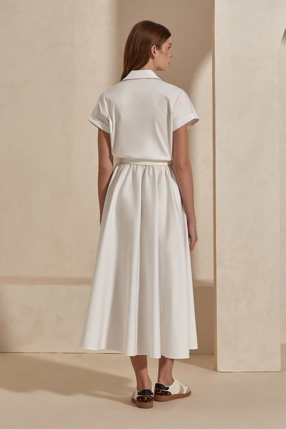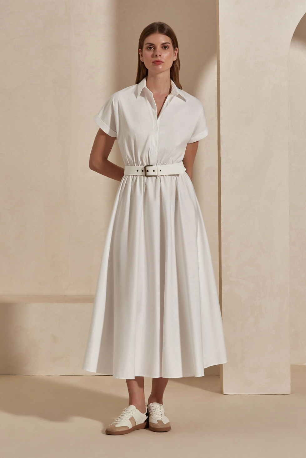 Suzan elbise, belindeki kemerle silueti zarifçe öne çıkarırken, dökümlü eteği akıcı ve elegant bir hareket kazandırır. Hafif ve ferah yapısıyla gün boyu konfor sunarak stilinizi zarafetle tamamlar.