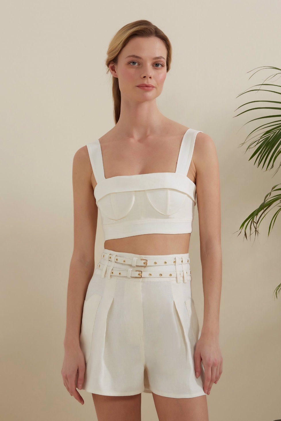 Shayna büstiyer, iç çamaşırı öğelerini ödünç alarak, gurur verici, romantik bir silüet ortaya çıkarır. Destek için iç balene ve arkada fermuar kapatmaya sahiptir. Crop büstiyerinizi yüksek bel altlar ile kombinleyebilirsiniz.