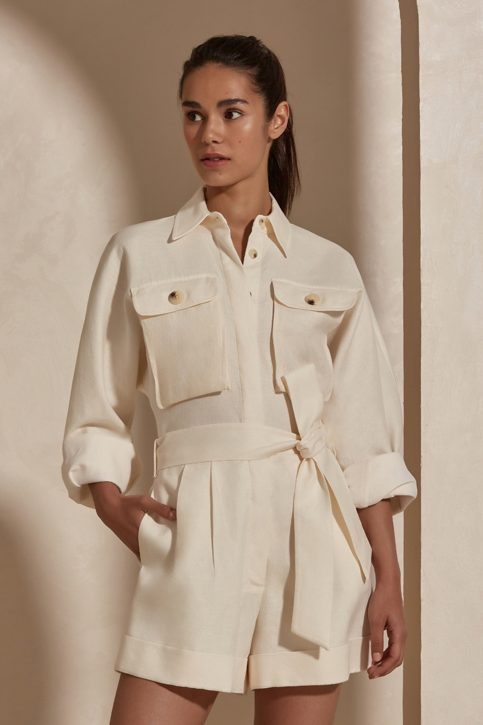 Dakota jumpsuit is a prime pick for sun-drenched days. Cut from linen the long-sleeved playful piece features a belt tie and safari-inspired chest pockets. Style with sandals and a raffia tote bag on your next island adventure.