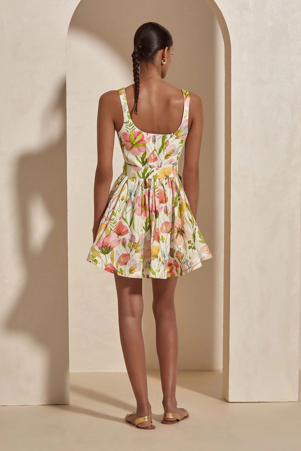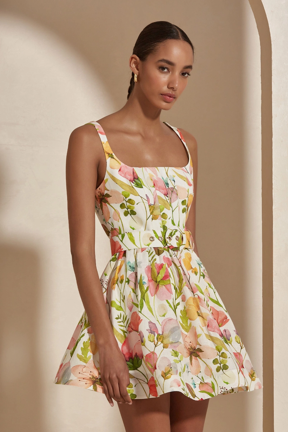 Irene Elbise, kare yakalı, korse görünümlü balenli üst kısmı ile vücut hatlarını zarifçe vurgular. Bel kısmındaki kumaş kemer, elbiseye sofistike bir hava katarken, mini ve kloş etek detayı ise hareketli ve rahat bir görünüm sunar.