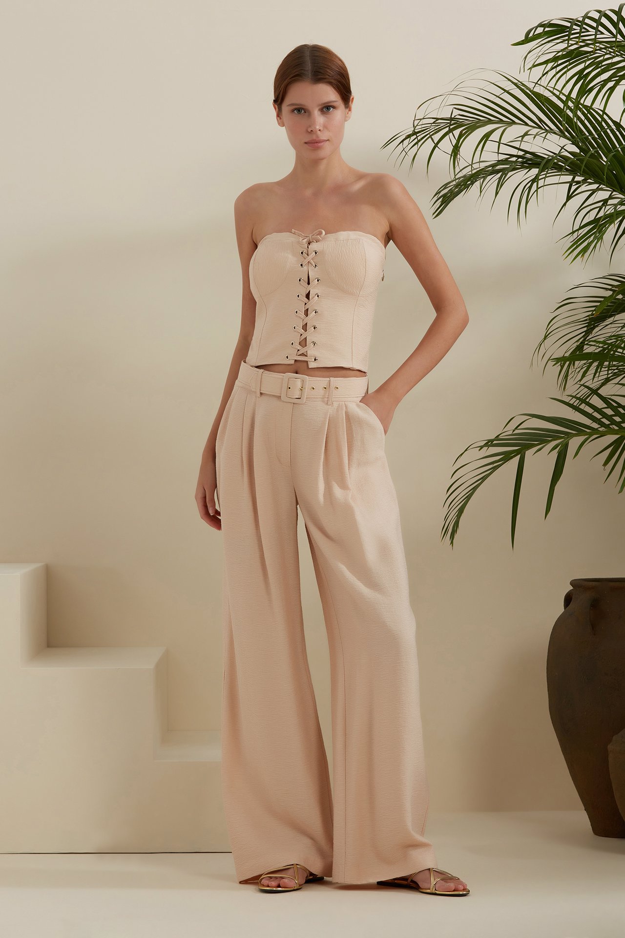 Dahlia Bianca's Paulina crop top reflects the label's chic and youthful aesthetic. The shoulder-baring strapless design is woven from pure fabric for a breezy feel and is finished with stylish lace-up panel on the front