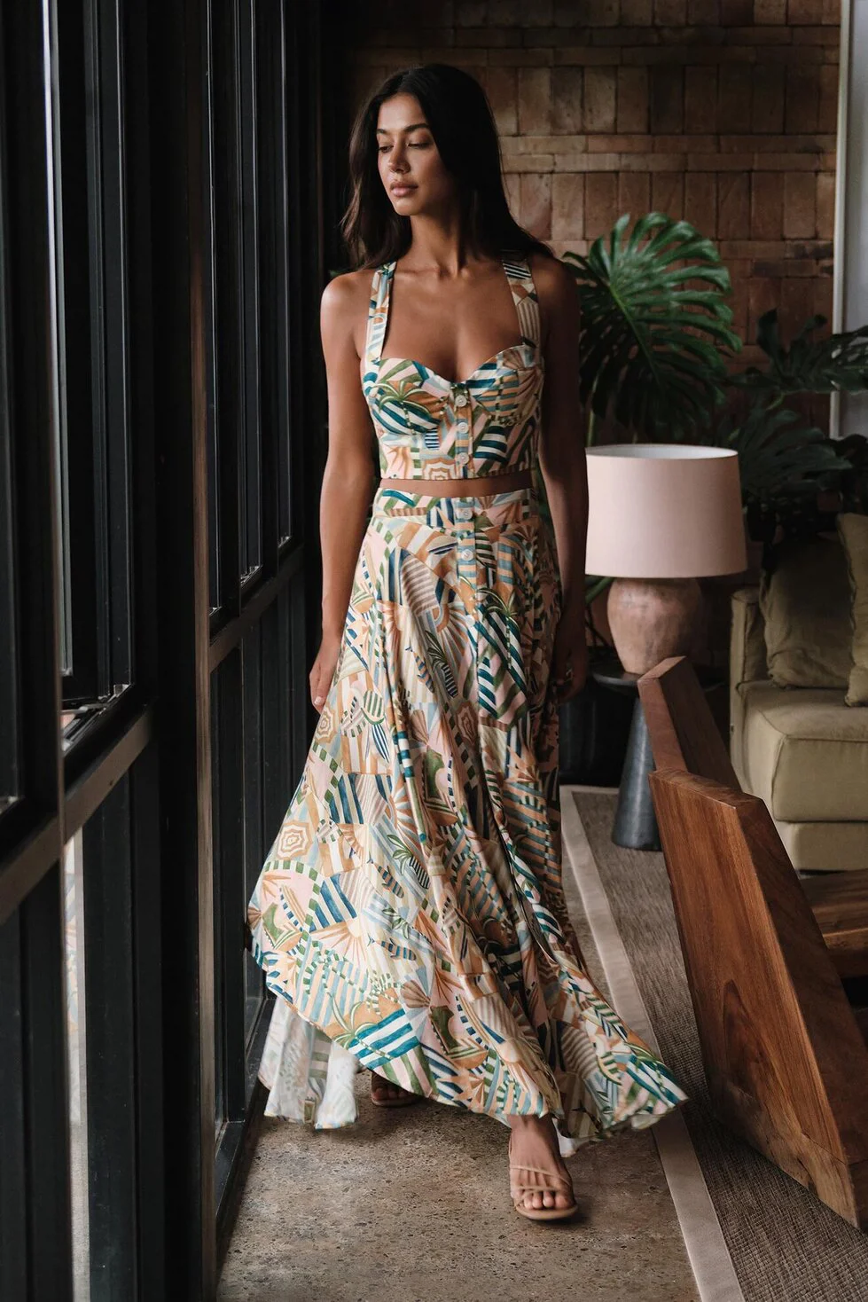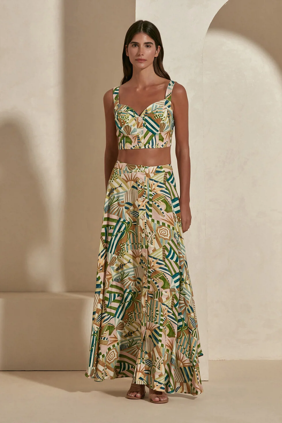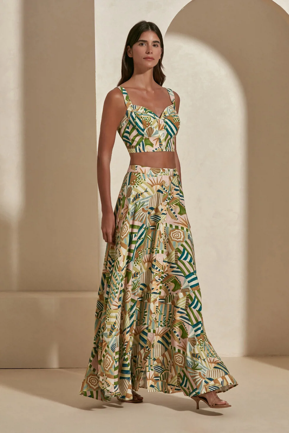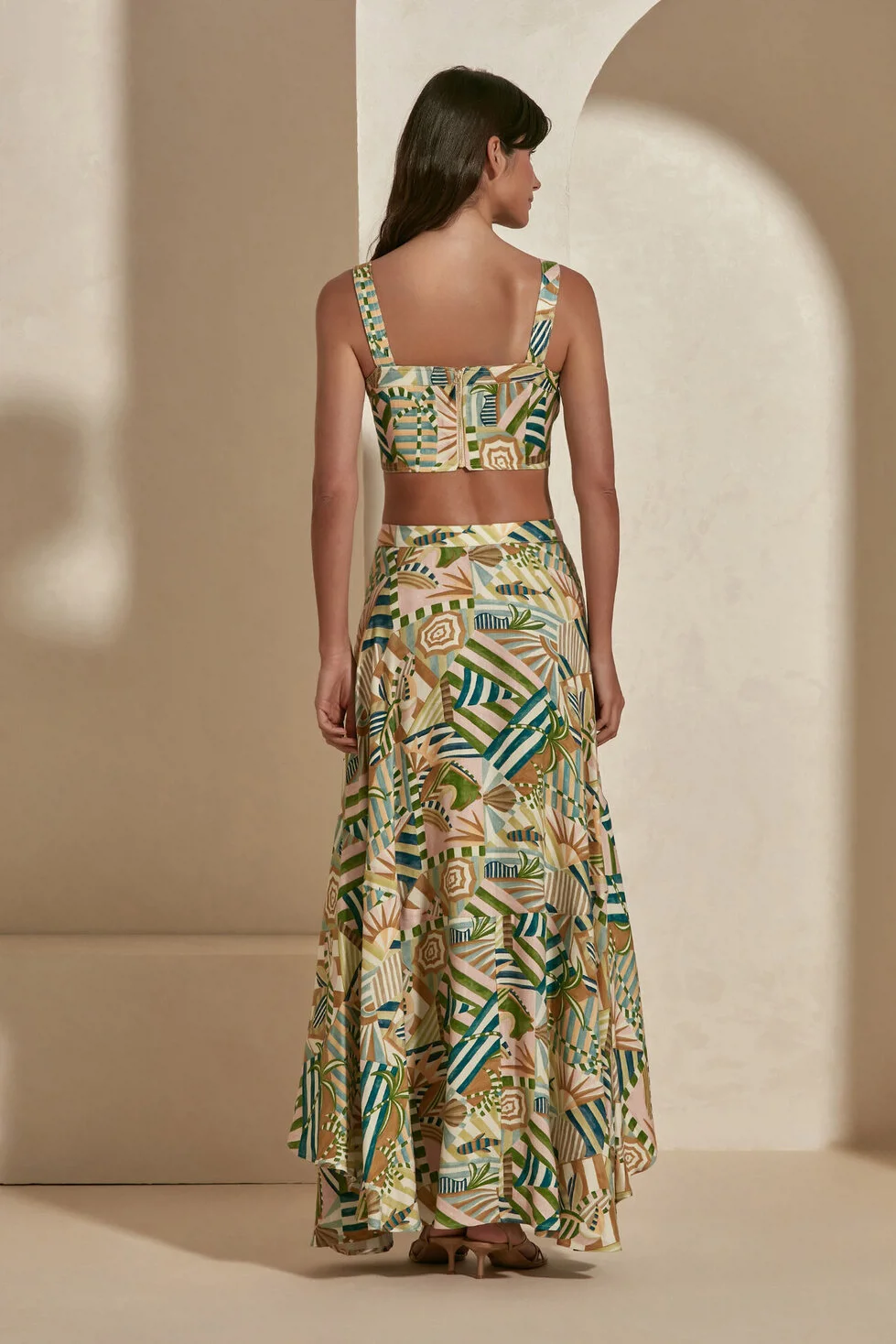 Get ready to add an artistic rhythm to your steps: the Bethany Skirt. Its geometric patterns, adorned with the unique harmony of fresh green tones and earth colors, bring a completely modern and dynamic interpretation to the classic maxi skirt form. While gently emphasizing your waistline thanks to its high-waisted cut, its fluid form that widens downwards creates a glamorous silhouette with every step. Bethany will be the indispensable choice for those who want to display a confident and sophisticated stance both in daytime elegance and at special evening events.