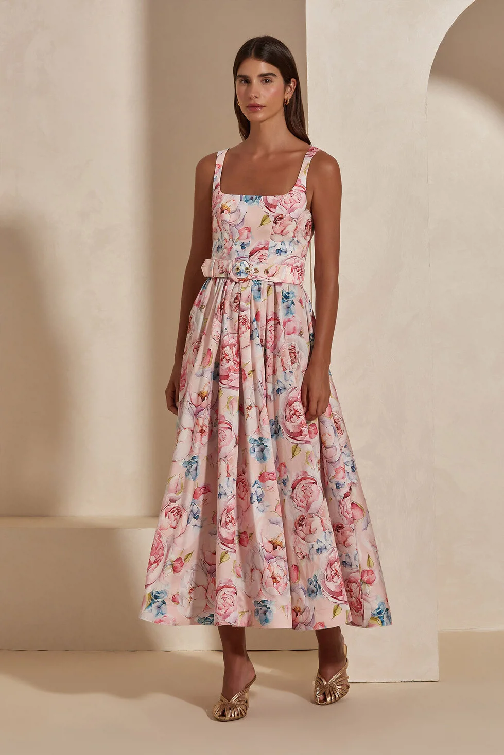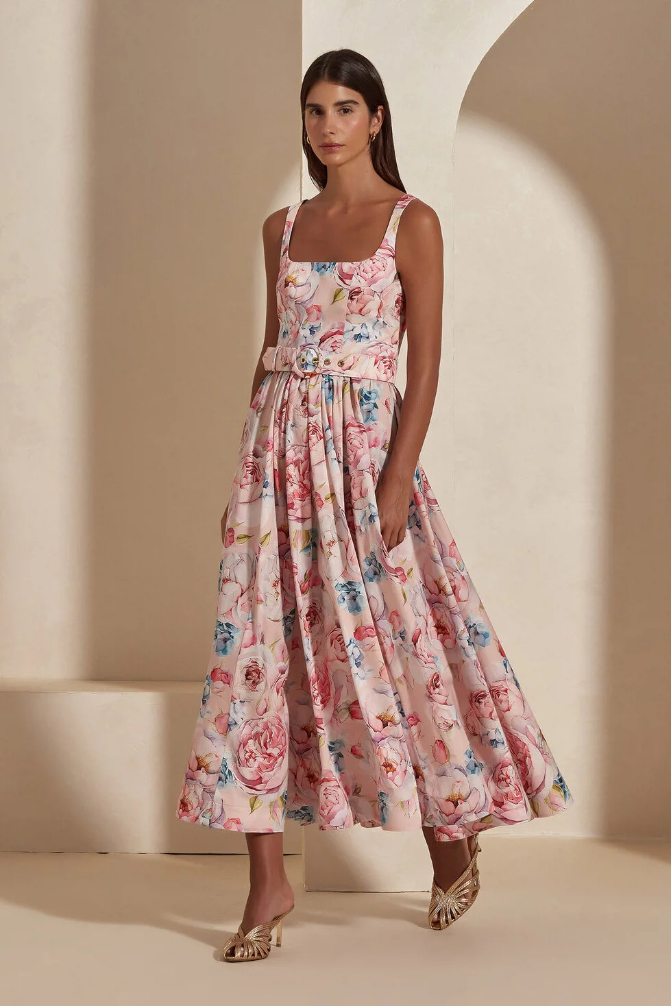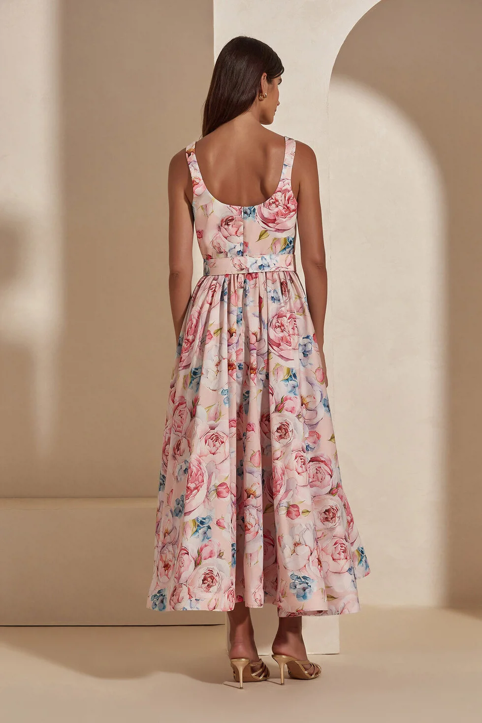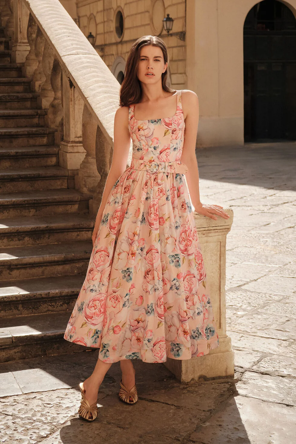 The Ciena Dress, as one of our most beloved models, brings together classic elegance and comfort. The natural and lightweight feel of its 100% cotton fabric, combined with the romantic energy of pink flower patterns, exhibits a captivating stance. Drawing a noble silhouette with its thin straps and a cut that gracefully hugs the bodice, this model gently emphasizes the waistline with its matching fabric belt. The voluminous skirt structure, which flares out from the waist, promises a confident and distinguished elegance at every step.