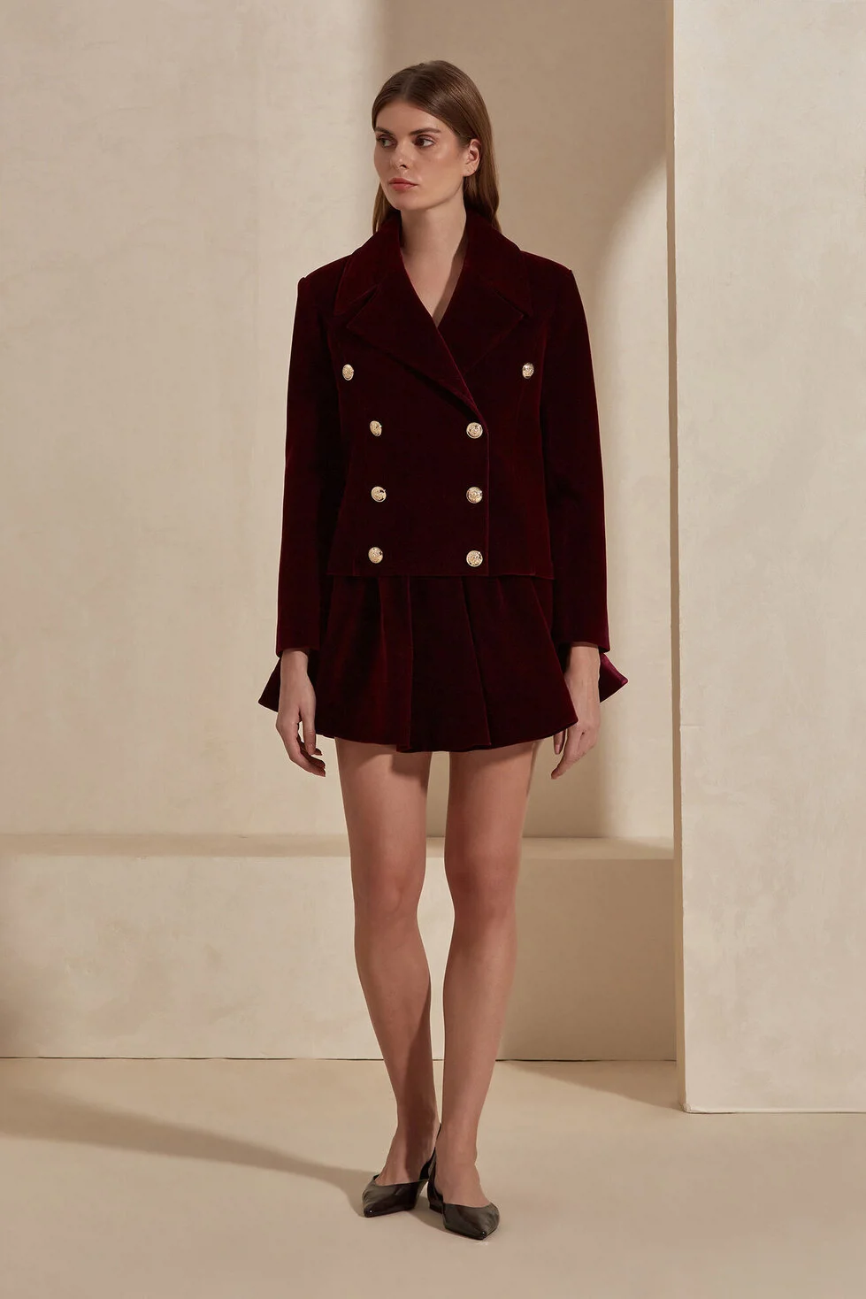 The bodice of the Irene Dress gracefully hugs the body with its square neckline and corset design, enhanced by the soft texture of velvet fabric. The voluminous, flared skirt creates a flowing silhouette, while the waistline is elegantly accentuated by a belt. Discreet zipper details at the back complete its refined look.