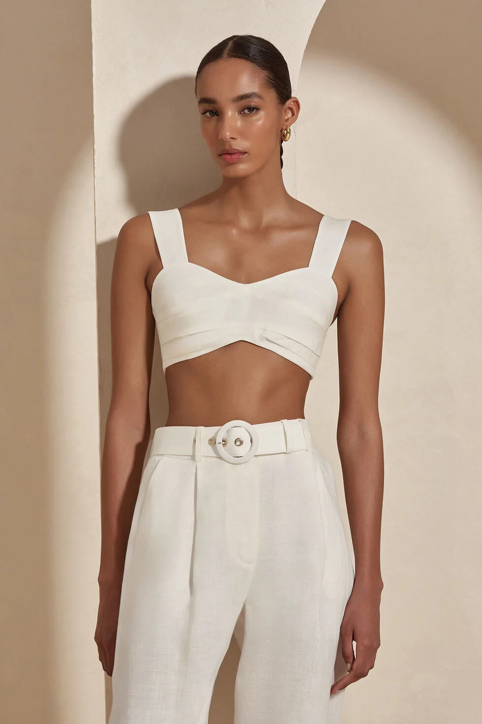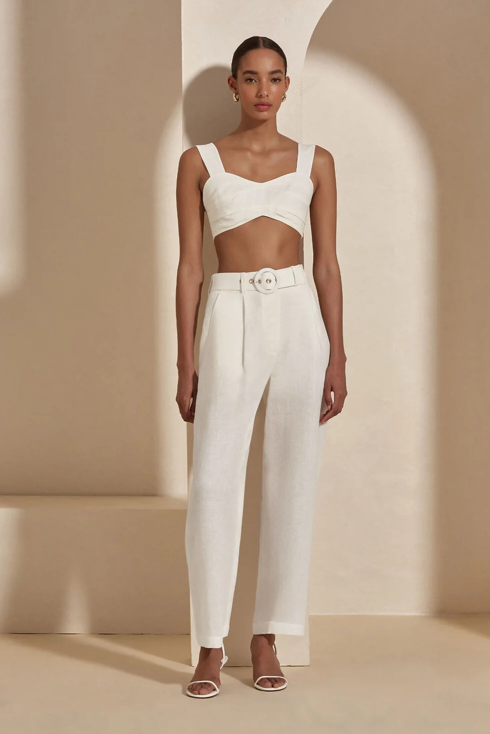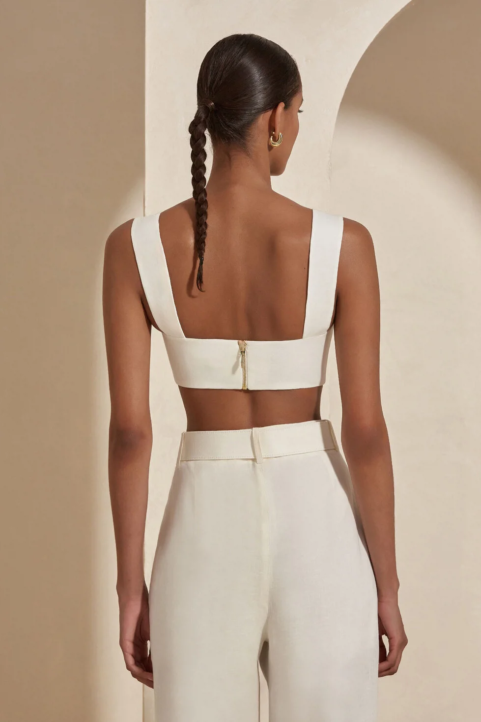 Leighton top is made of linen with a nature-inspired color. The blouse, which blends a heart-shaped neckline, thick straps and front part with sewing games, is designed to fit the body perfectly. Wear it with an oversized blazer or pair it with high waist bottoms.