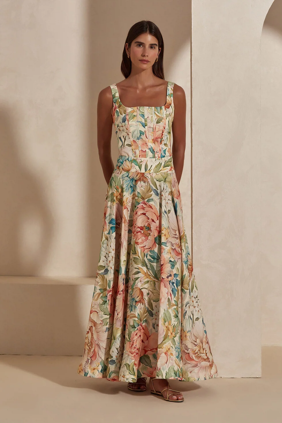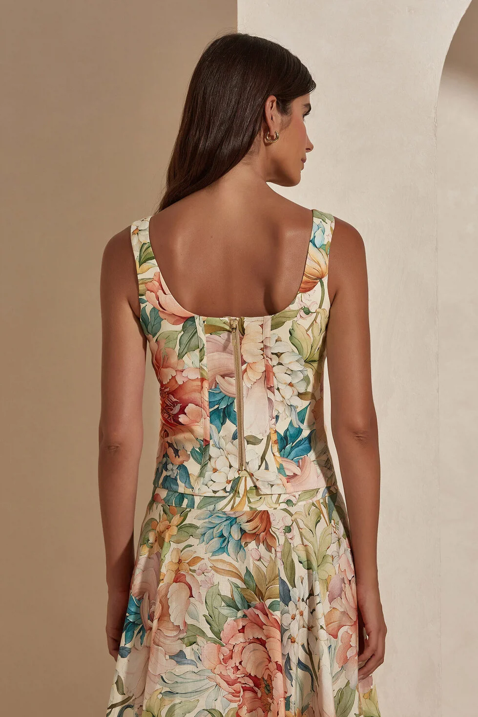The Maxine Bustier blends the natural texture of 100% linen with a modern, feminine corset-inspired silhouette. Featuring an elegant square neckline, thick straps, and soft floral patterns, this piece offers effortless sophistication that transitions seamlessly from daytime events to evening gatherings.