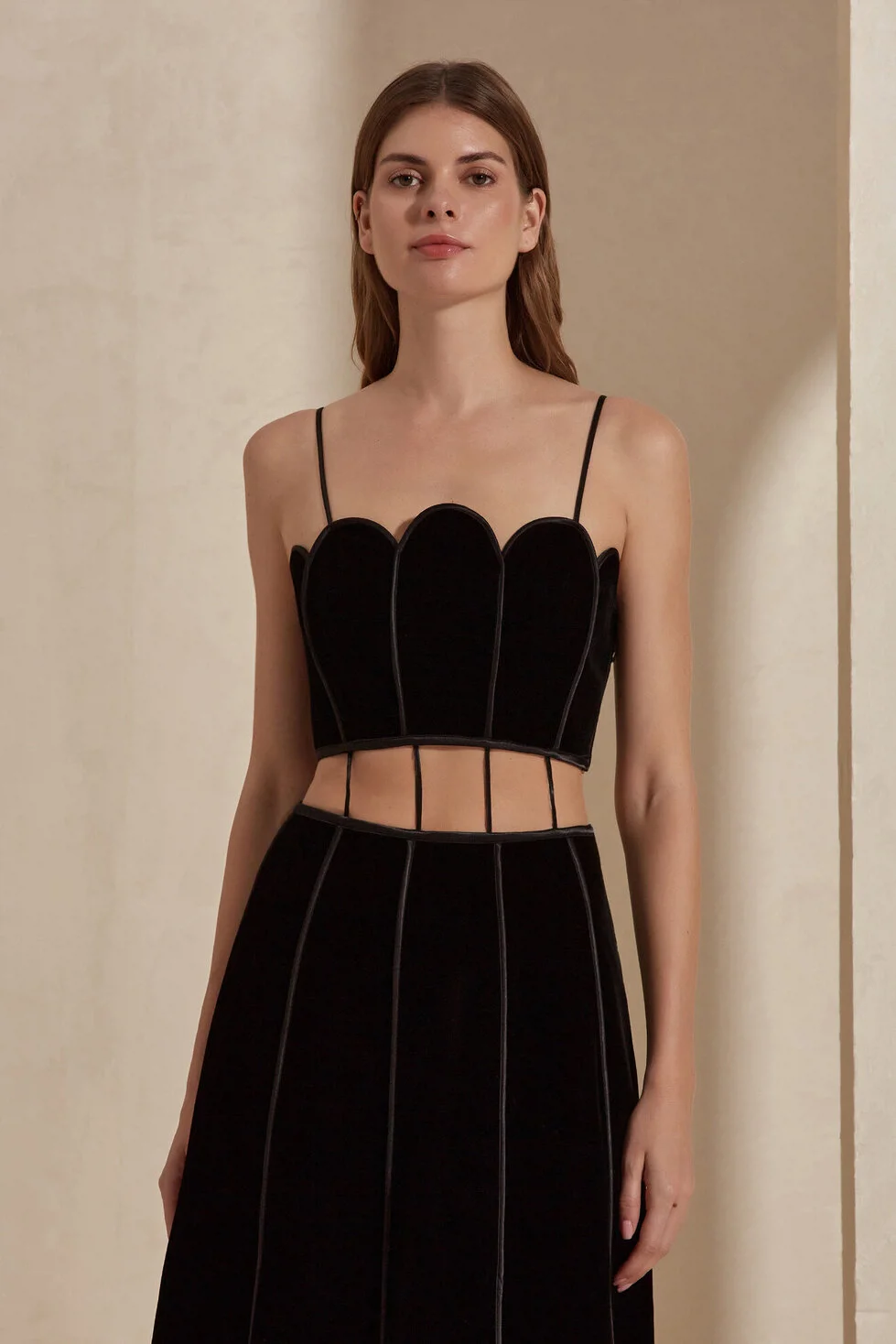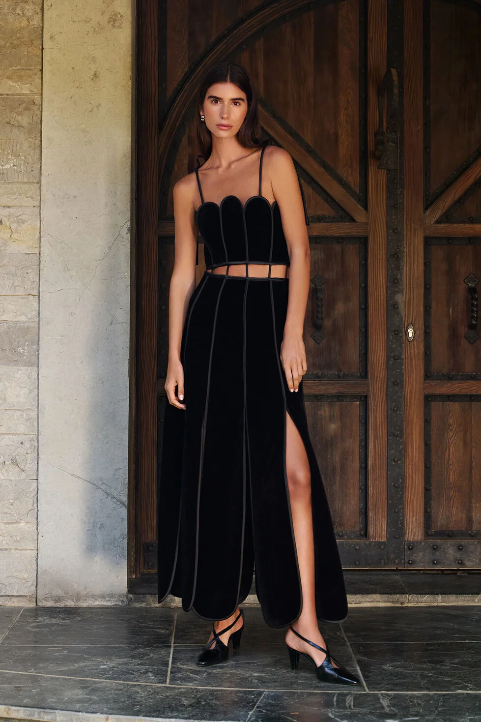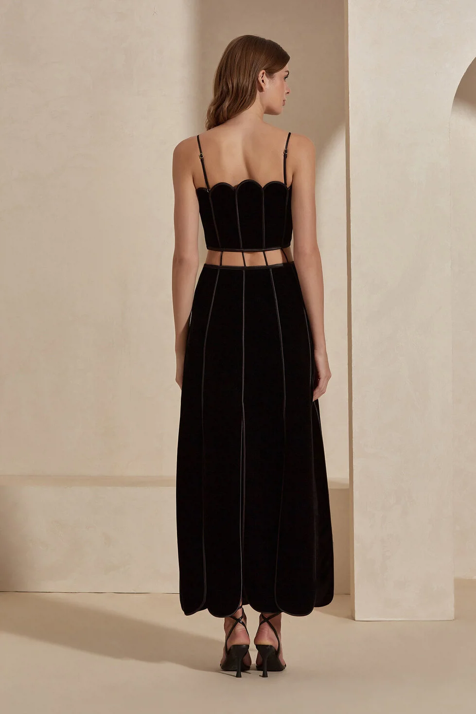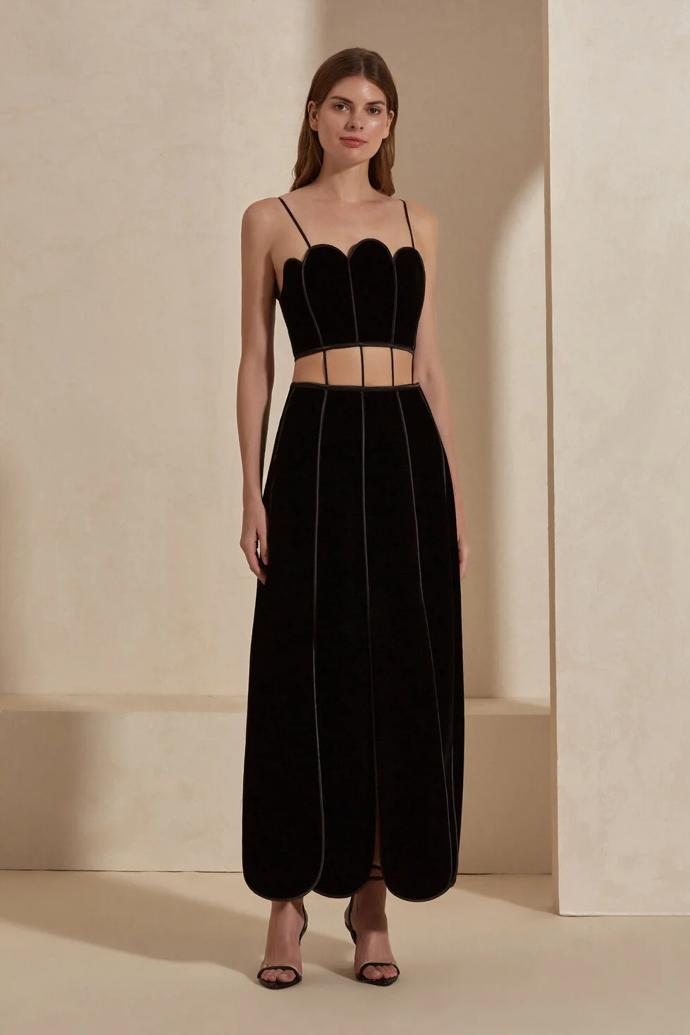 The Reina dress features an adjustable shoulder cord for a secure fit. Its eye-catching cage cut-out detail at the waist, combined with a paneled skirt accented by multiple slits, creates fluid movement and a bold, striking silhouette for the wearer.