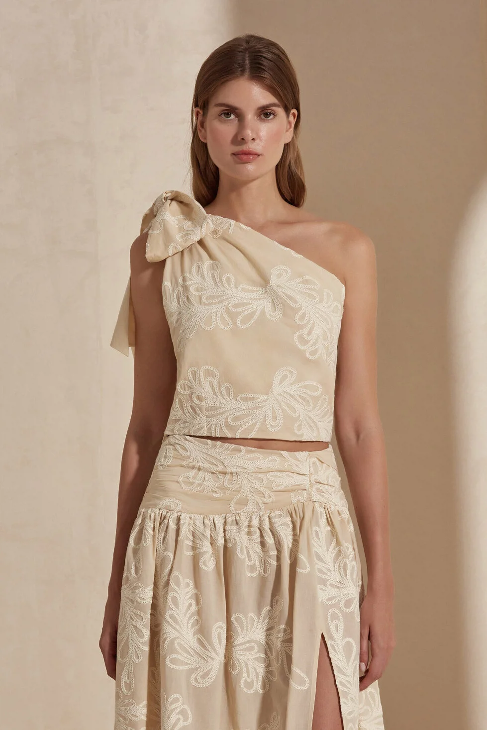 The River Blouse combines artisanal details with a modern, asymmetric form. The naturally breathable structure of its 100% cotton fabric, paired with carefully crafted floral embroidery details, offers sophisticated elegance. Featuring a single-shoulder cut and an iconic bow detail on the shoulder, this blouse draws a dynamic silhouette that adds a distinguished touch to both day and night styles. With its natural fabric and elegant embroidery, River represents the most refined version of effortless grace.