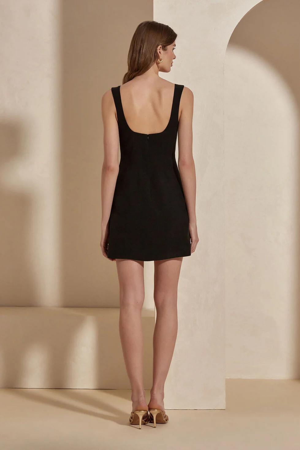 The Roberta Dress features four gold flower-shaped buttons at the front, making a striking statement. The ruffled stitching at the hem adds a graceful touch, enhancing the dress with an elegant flow.