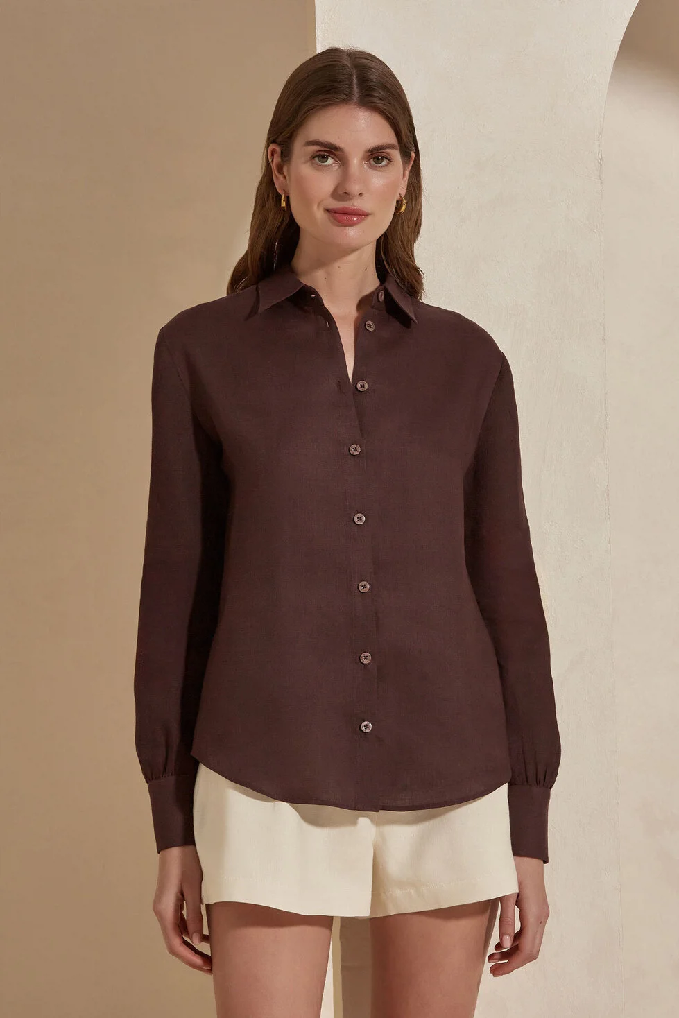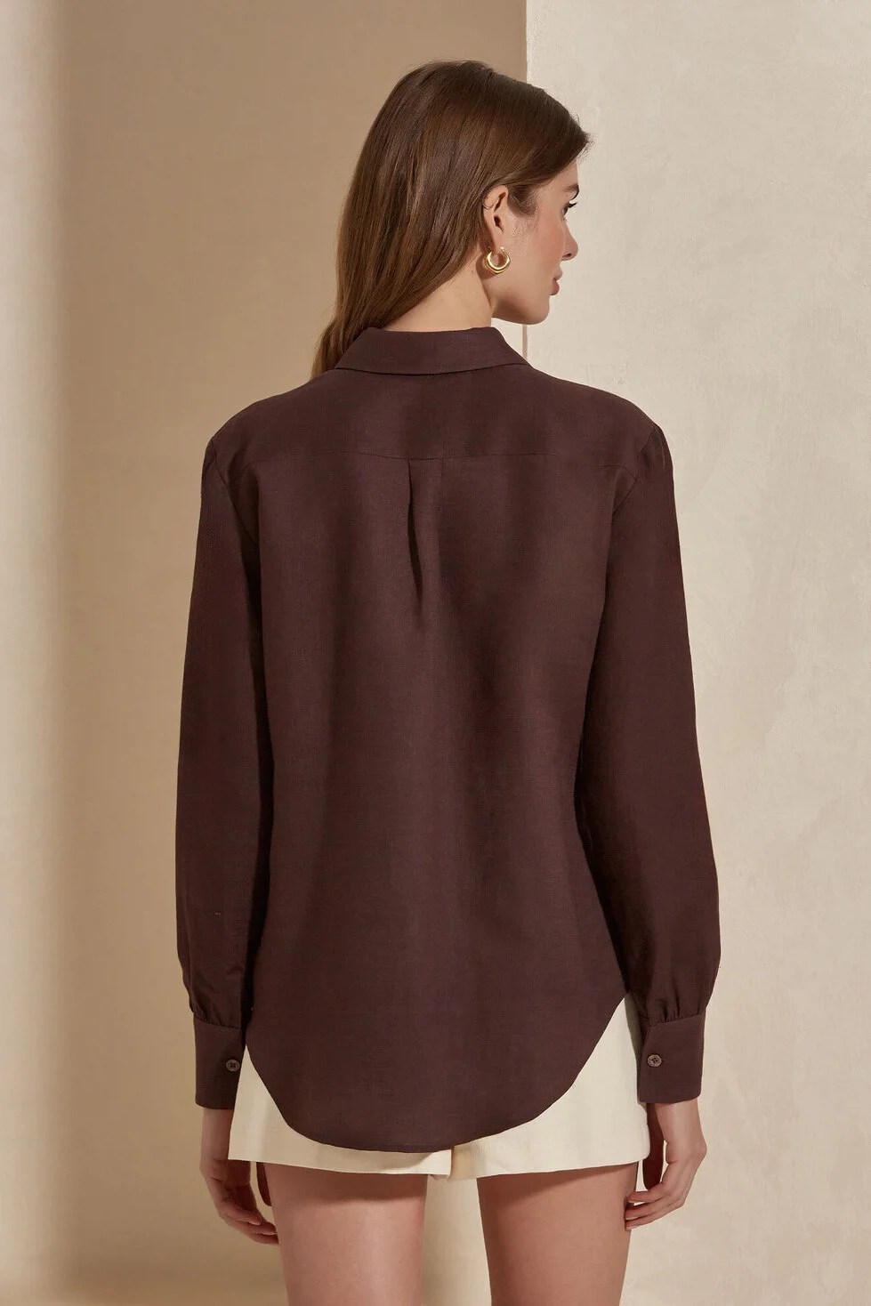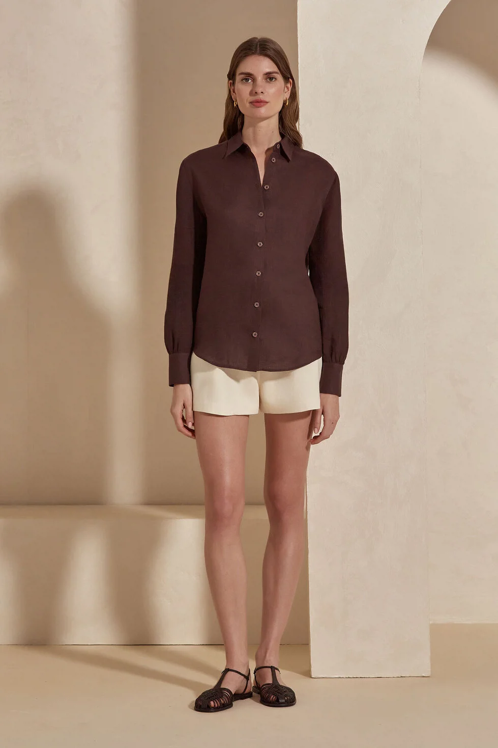 Blending masculine lines with feminine strength, the Sadie Shirt pairs its classic silhouette with elevated details. Highlighted by a signature Dahlia Bianca logo button, this standout piece is a wardrobe essential from everyday moments to evening elegance.