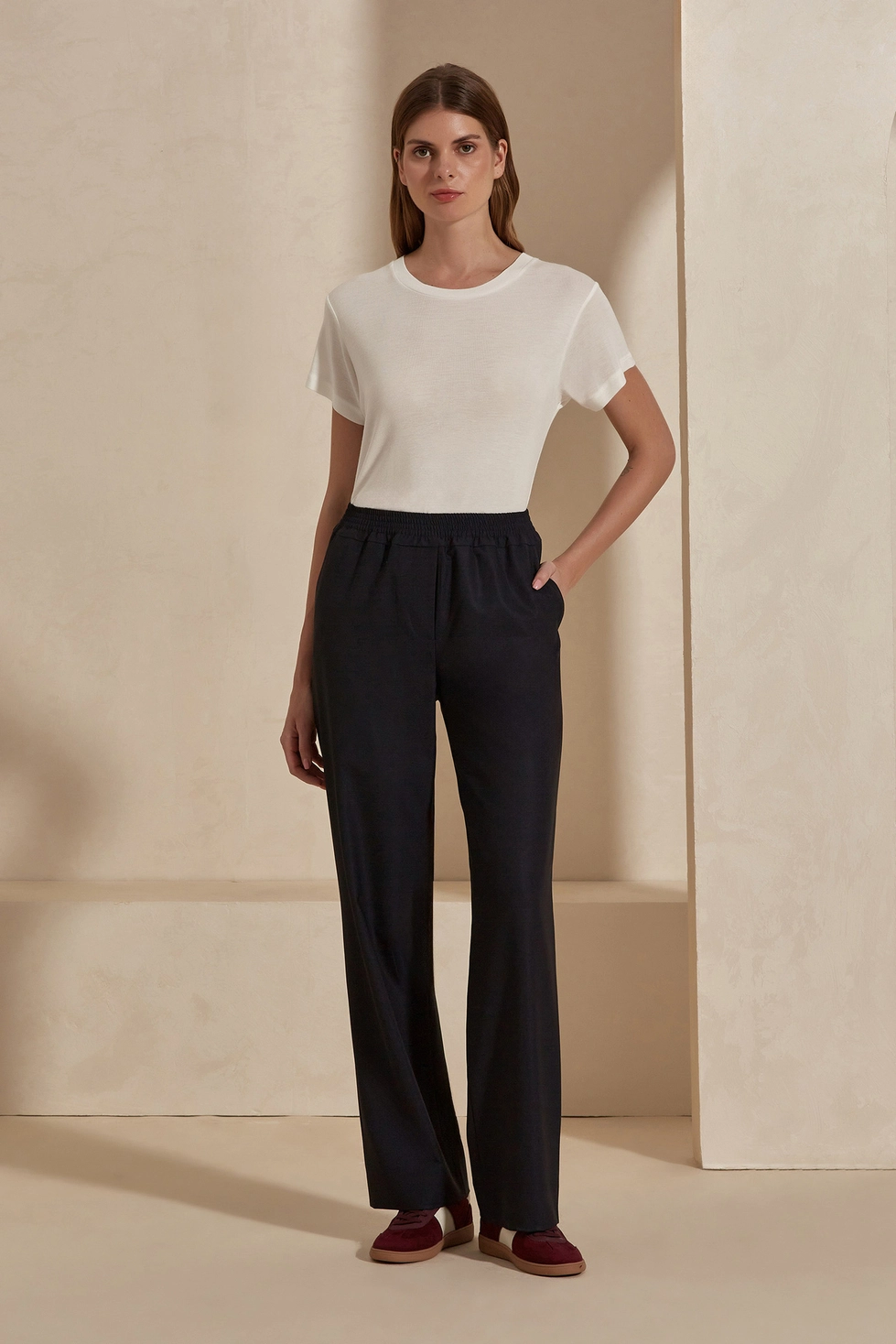Miranda bol paça pantolon, zarif tasarımı ve rahat kalıbıyla hem günlük kombinlerinizde hem de özel davetlerde stilinize modern bir dokunuş katıyor. Yüksek bel kısmındaki lastikli yapısı gün boyu konfor sağlarken, dökümlü ve geniş paça kesimi şık bir siluet oluşturuyor.