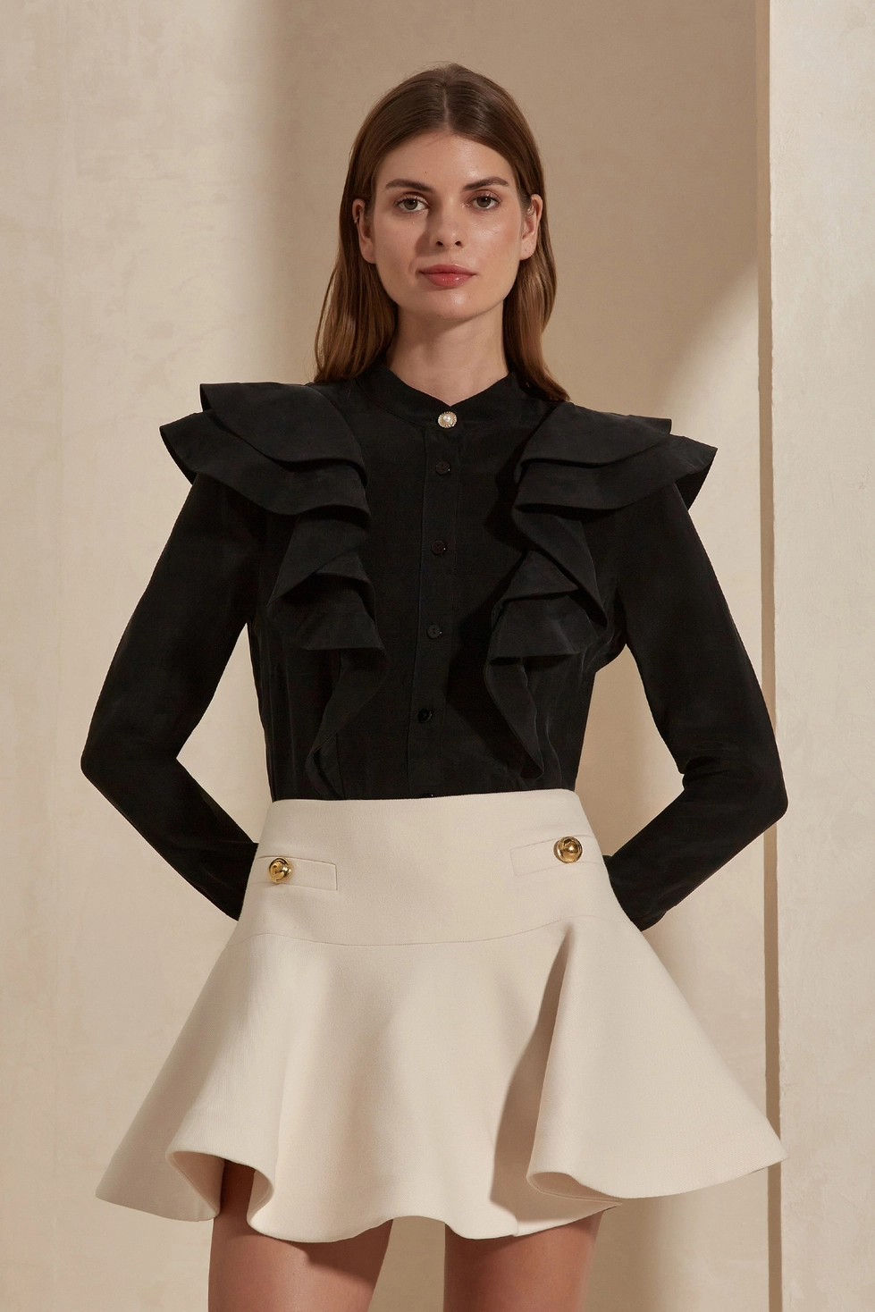 Roja etek, sade ekru rengiyle zarif bir görünüm sunuyor. Üzerindeki şık altın düğme detayları, bu mini eteği modern ve şık hale getirirken, uç kısmındaki volanlar da hareket katıyor. .