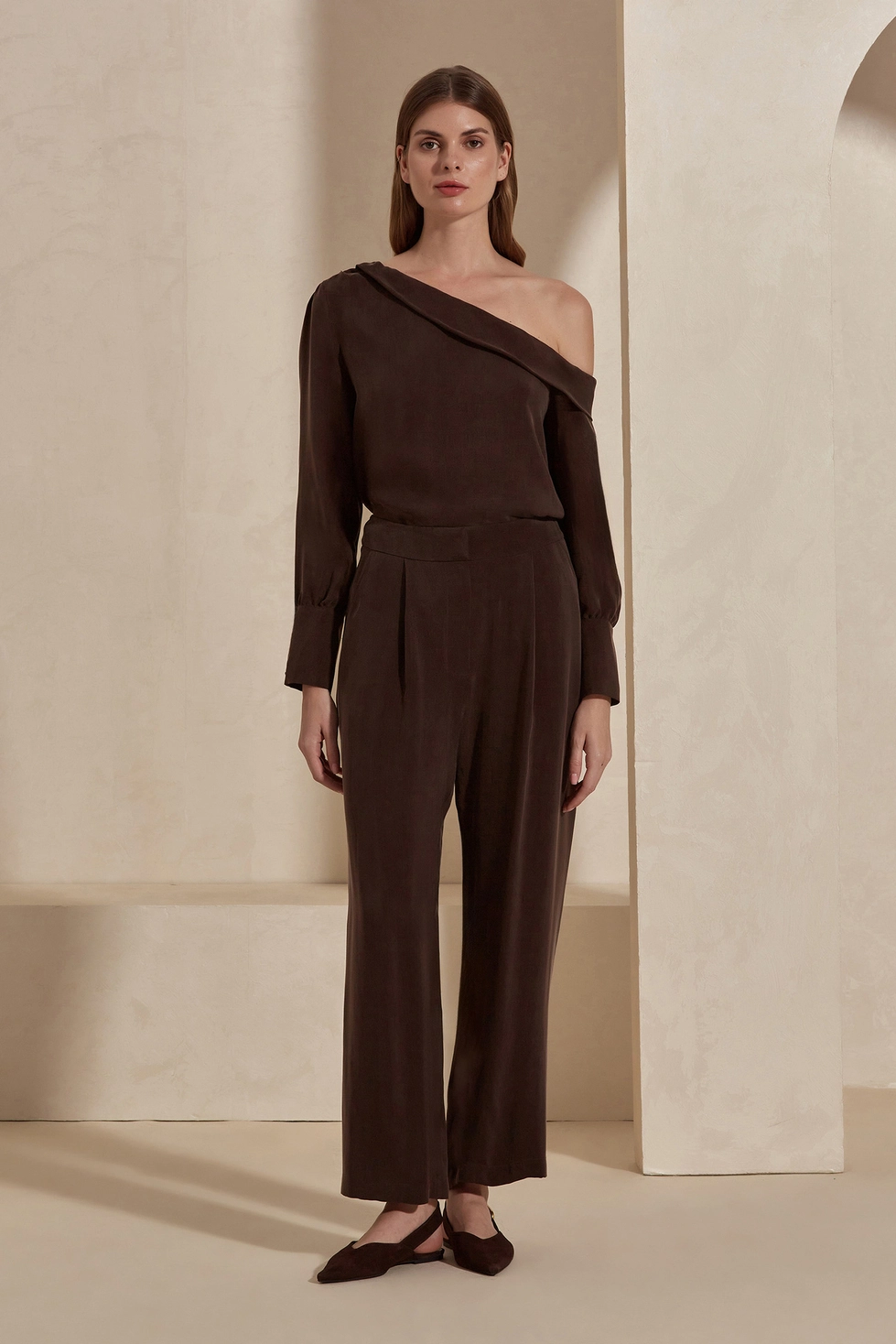Alicia bluz, asimetrik omuz detayı ve modern kesimiyle güçlü bir şıklık sunar. Tek omuz açık formu feminen bir duruş kazandırırken, dökümlü kumaşı zarif bir siluet yaratır.
