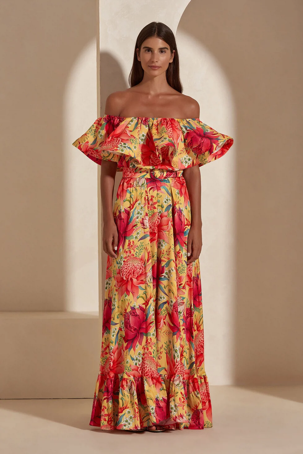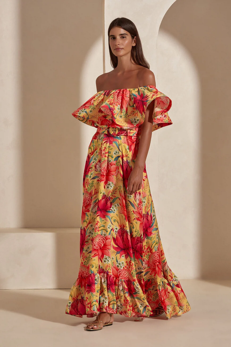 Audrey Elbise, düşük omuz kesimi ve volanlı üst detayıyla feminen bir siluet sunar. Beldeki kemer zarif bir duruş katarken, hem günlük şıklık hem de özel davetler için ideal bir seçimdir.