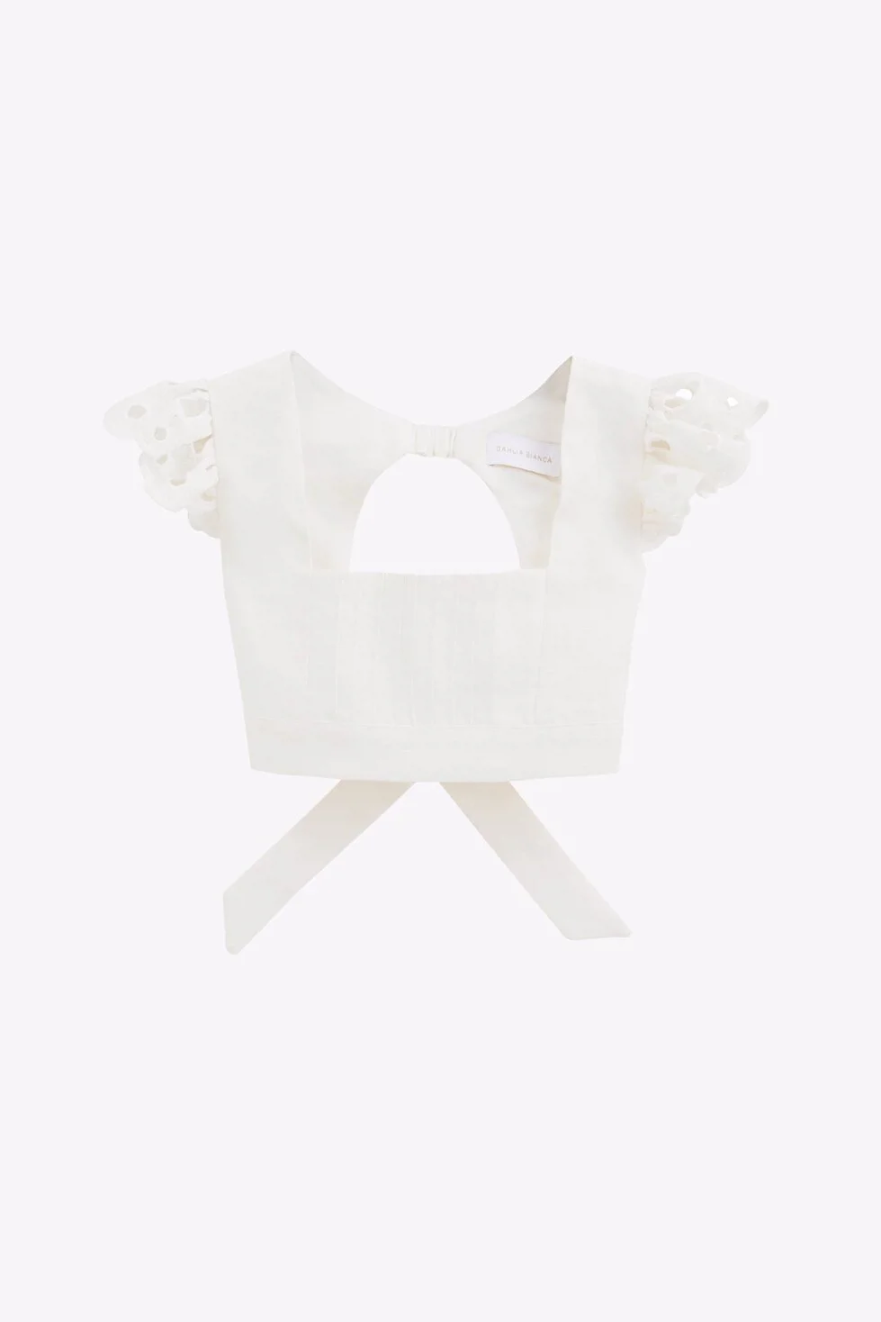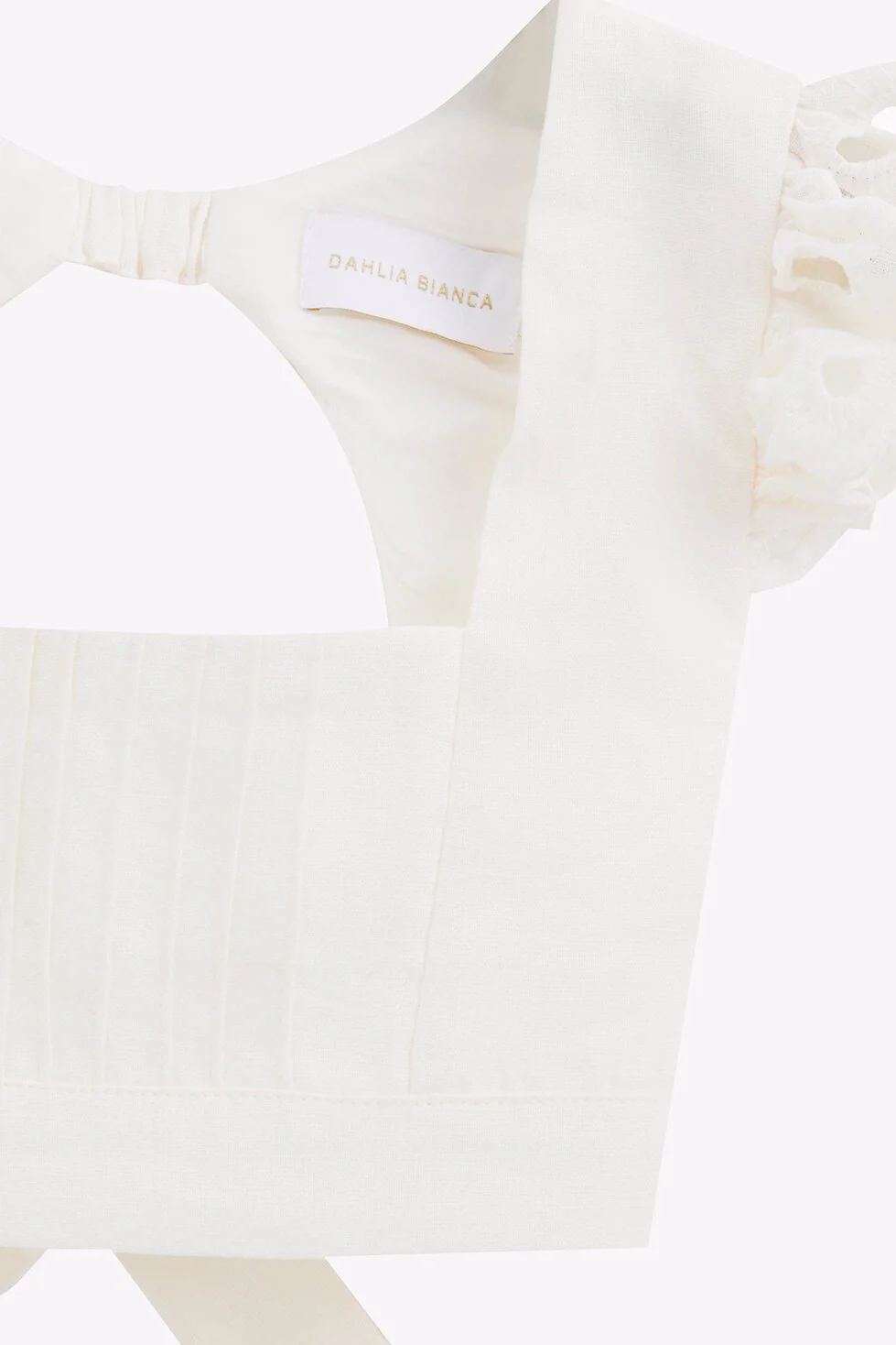Dahlia Bianca'nın kadın ve çocuk koleksiyonu için hazırladığı Lily bluz kare yakalı, ön kısmı pilili, omuzları fırfırlı ve arkası açık bağcık detayıyla miniklerin vücuduna göre ayarlanabiliyor.
