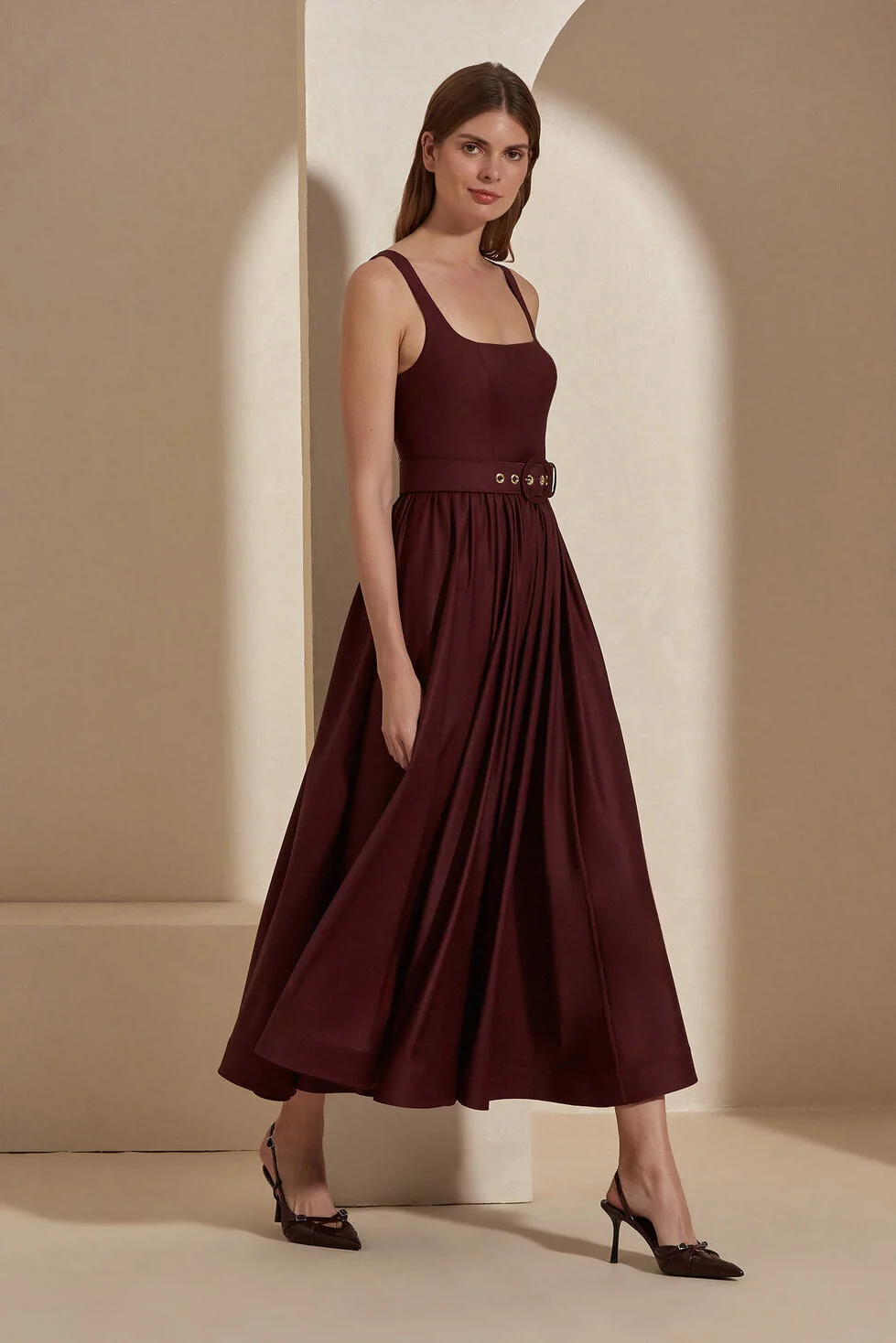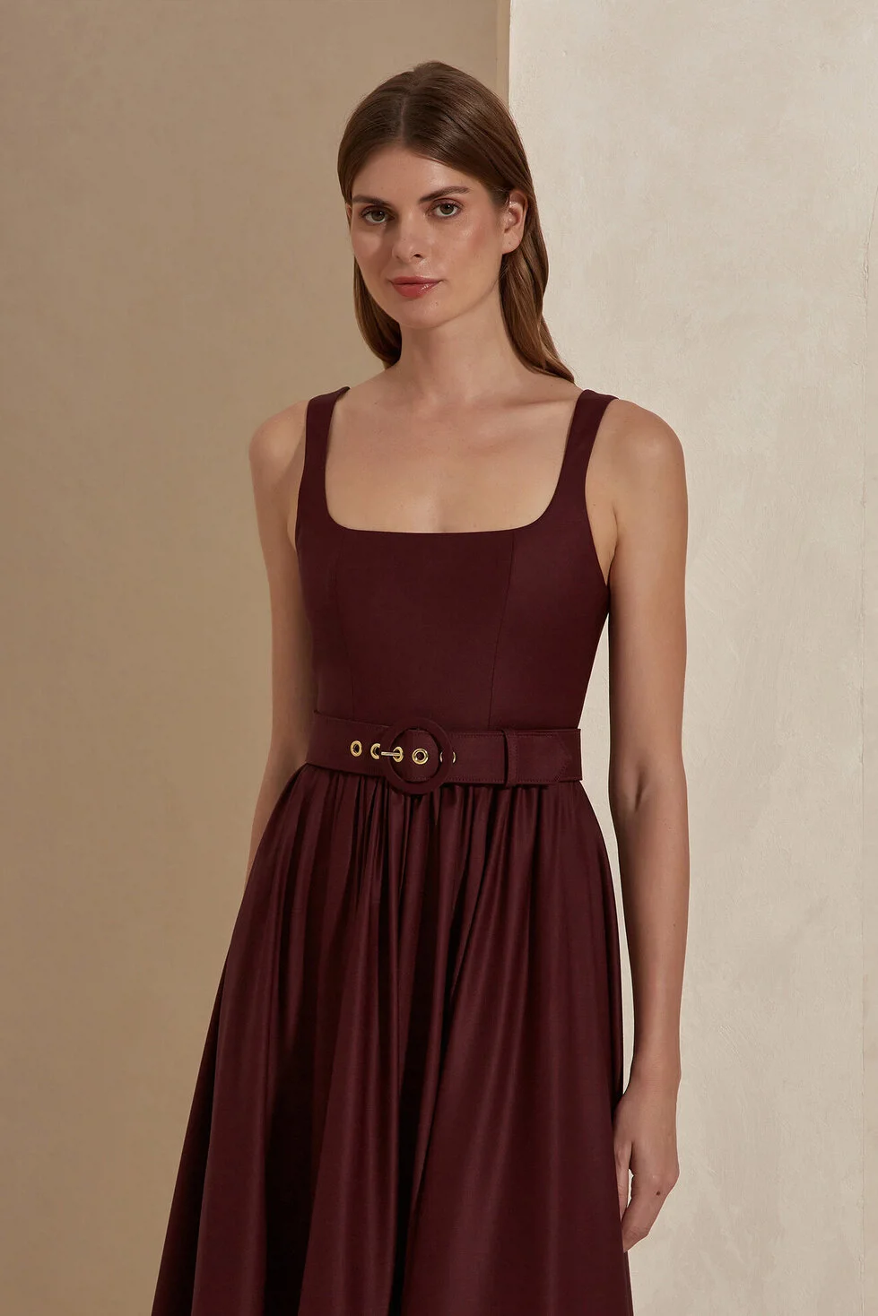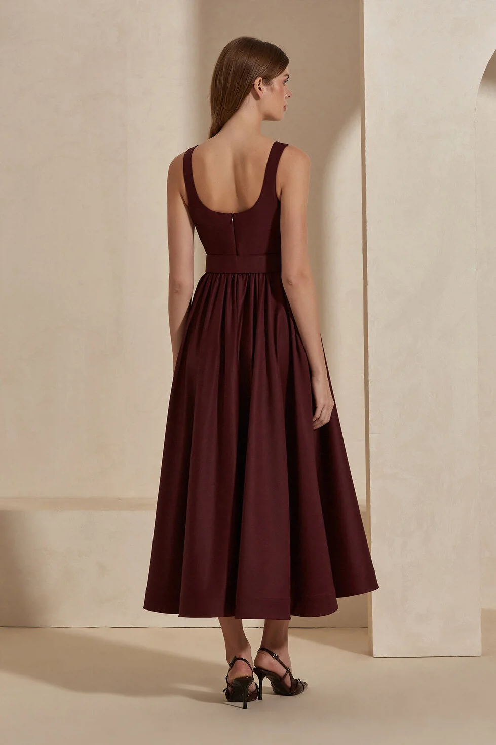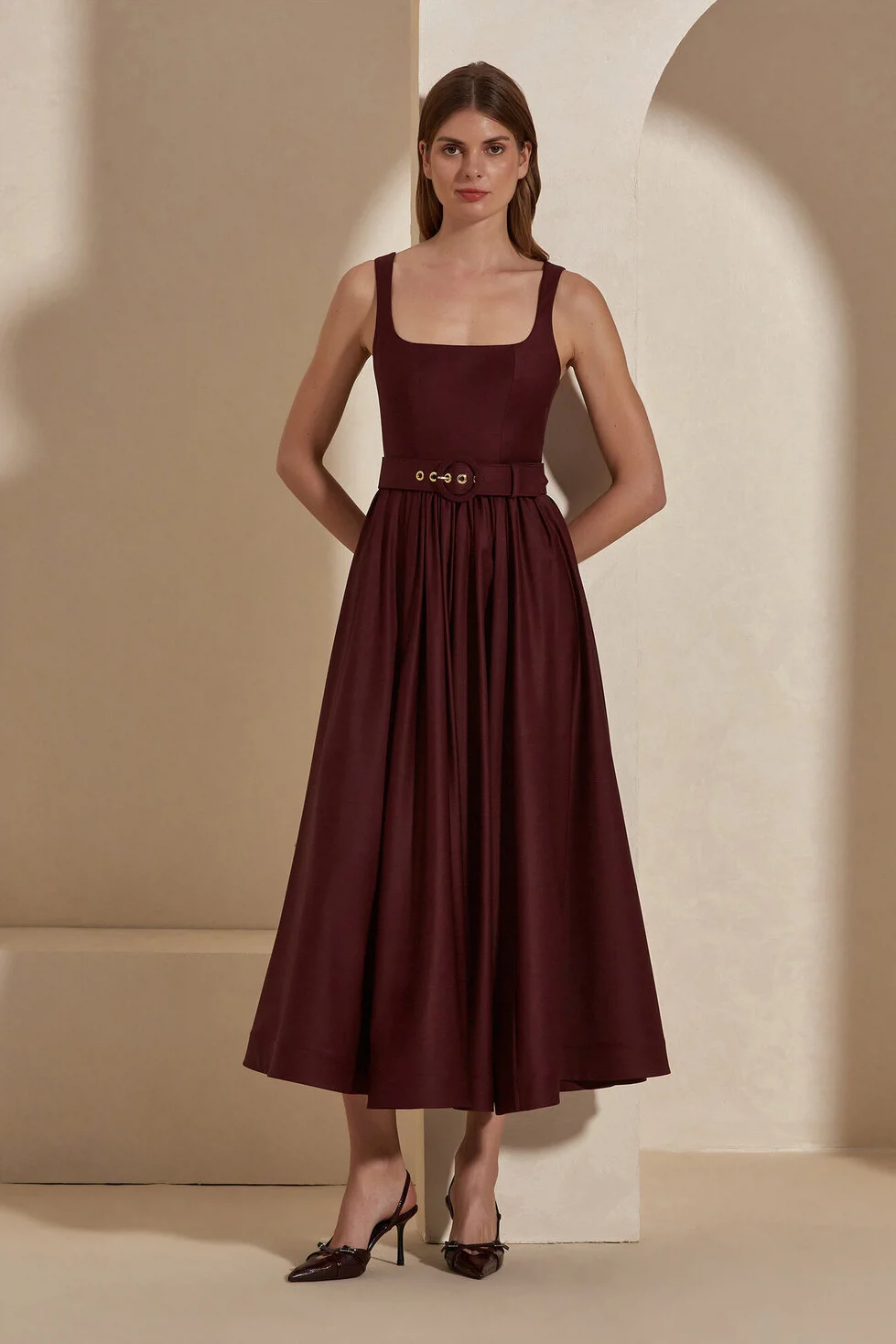 Corinna Elbise,zamansız midi kesim, belirgin kare yaka ve yün karışımlı kumaşı ile; anlık trendlerin etkisinde kalmayan, sofistike ve kendinden emin bir duruş sergiliyor.