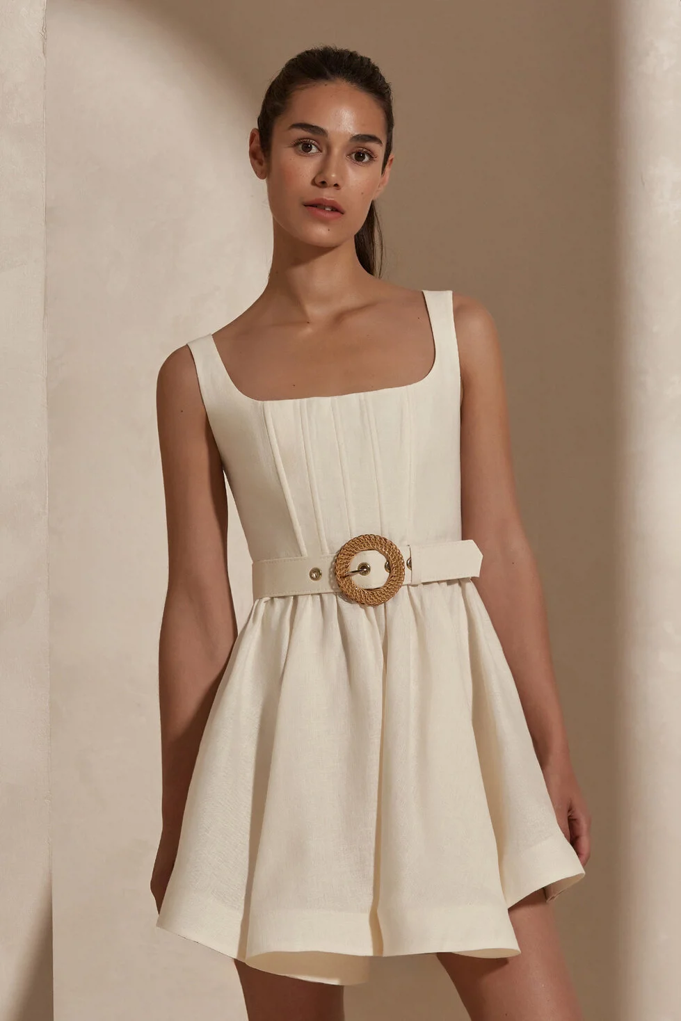 Dahlia Bianca'nın Irene elbisesinin dar kesimi onu dans pistleri ve yaz akşamları için mükemmel kılıyor. Kare yakalı ve korseden ilham alan üst bedene sahiptir. Belinizi ortaya çıkarmak için kendi kumaşından kemeri ile kombinleyebilirsiniz